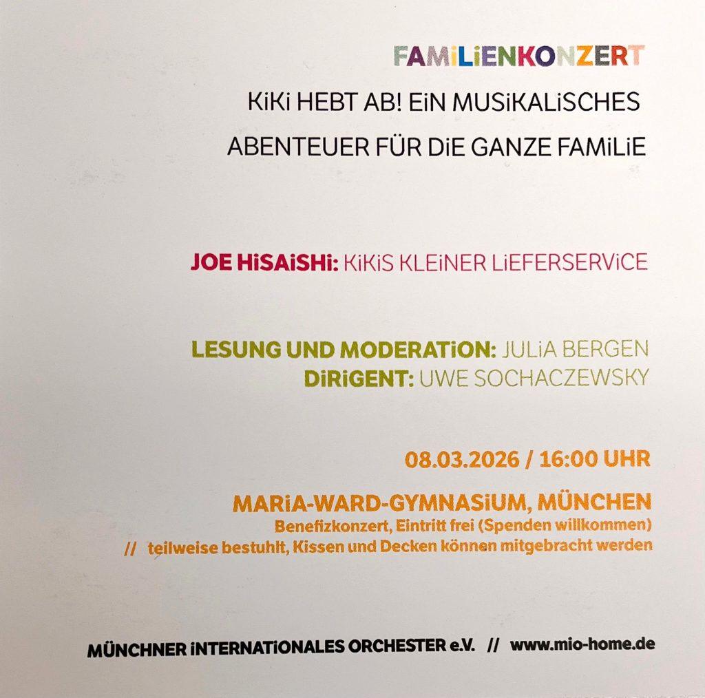 Am Sonntag, den 8. März 2026, um 16:00 Uhr veranstaltet das Münchner Internationale Orchester (MiO) im Maria-Ward-Gymnasium ein Familienkonzert gemeinsam mit dem Maria-Ward-Orchester (MWO).